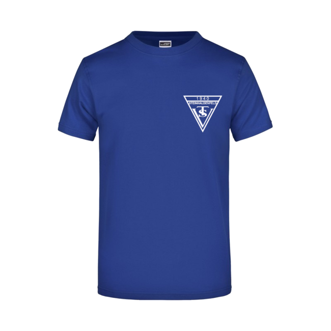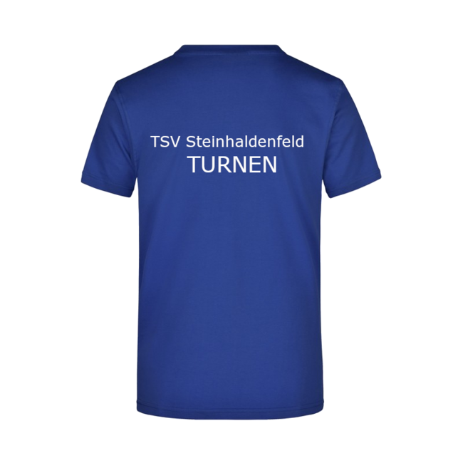 Auf den Kleidungsstücken ist vorne links das TSV Steinhaldenfeld Wappen und hinten die Aufschrift „TSV Steinhaldenfeld Turnen“ zu sehen. Die T-Shirts sind royalblau mit weißem Druck.